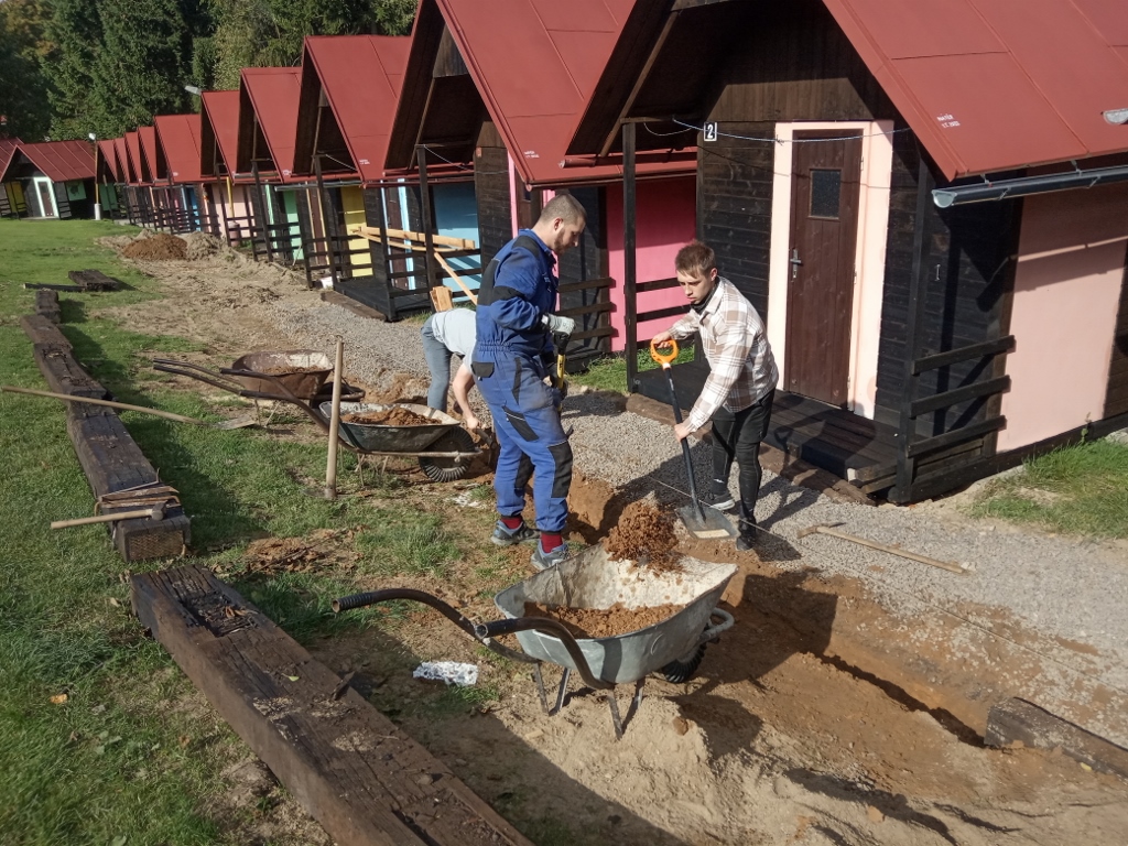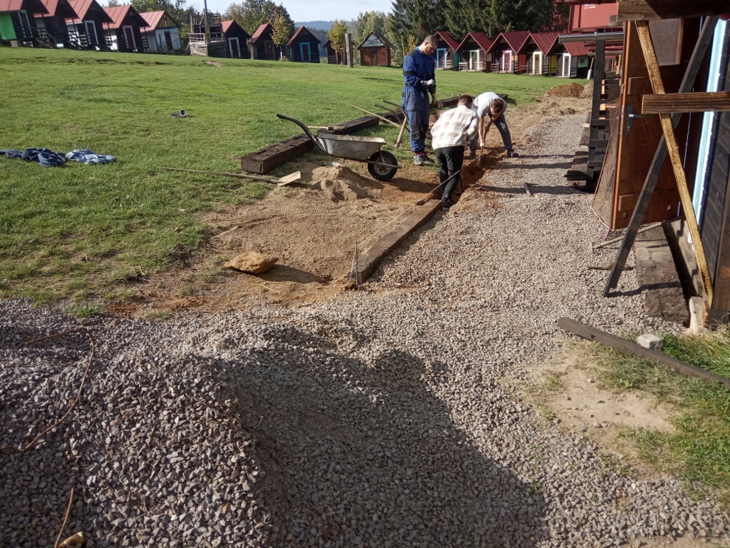 .jpg) | V sobotu pracujeme - kluci tvoří lem chodníku u chatek |