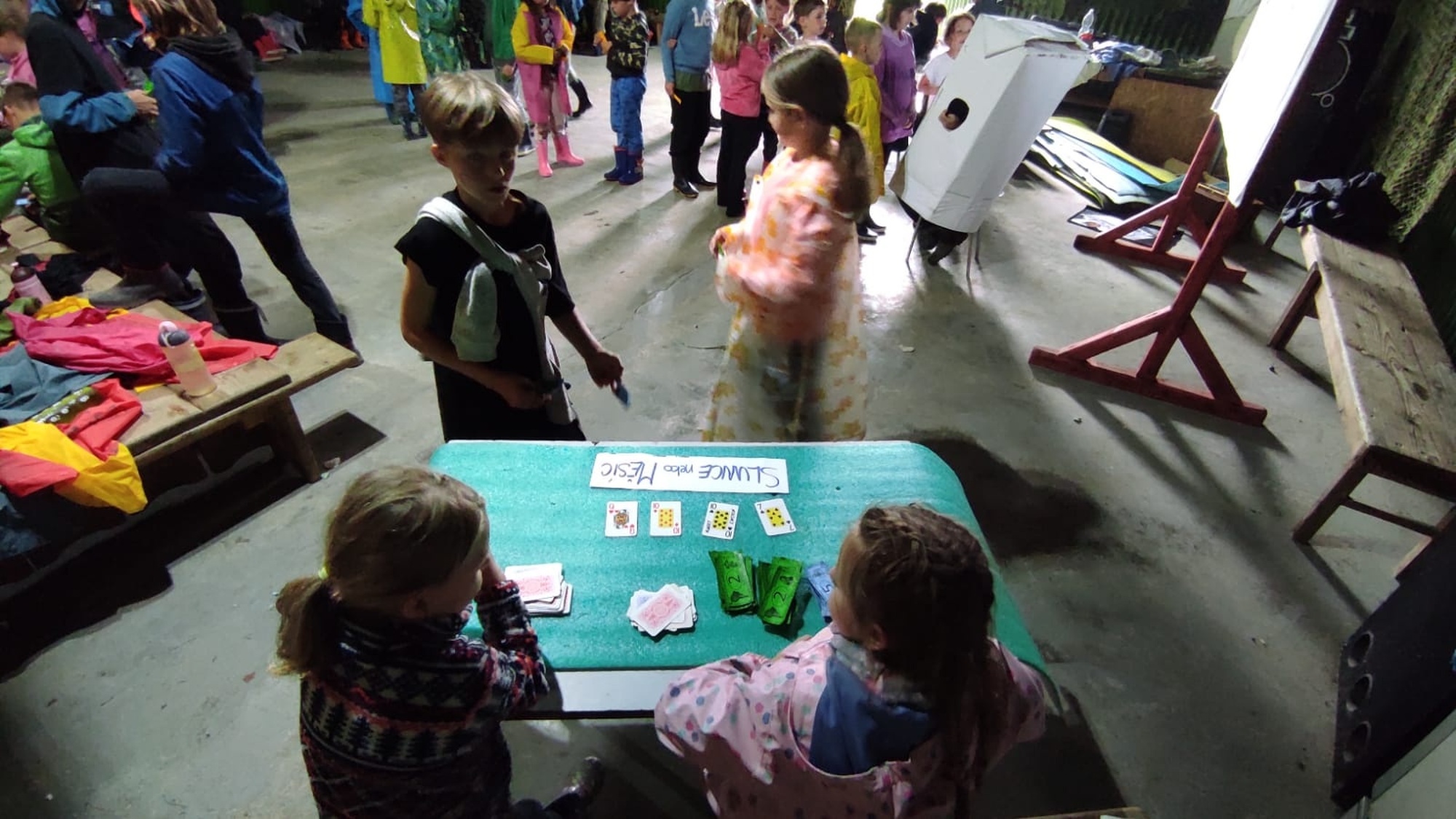 | Tčko se před deštěm ukrylo do jídelny a hraje drobné hry |