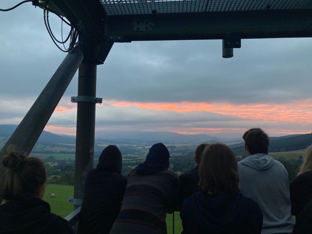 | Unavení, ale spokojení Tčkaři na rozhledně v době, kdy většina ostatních lidí ještě spí |