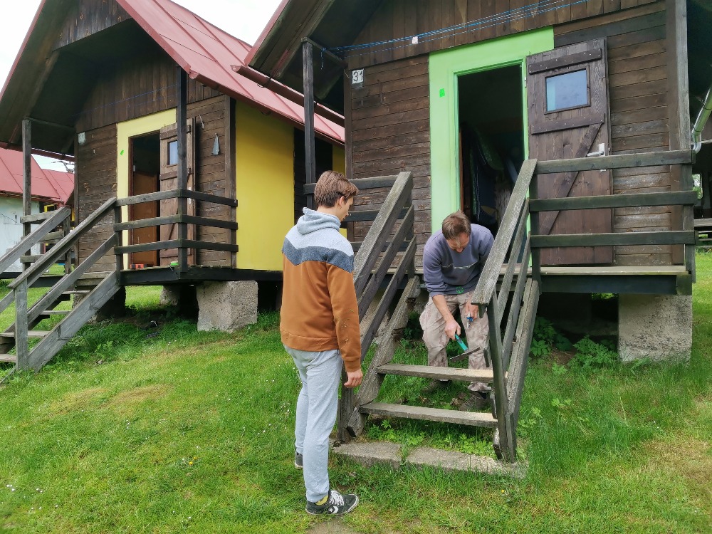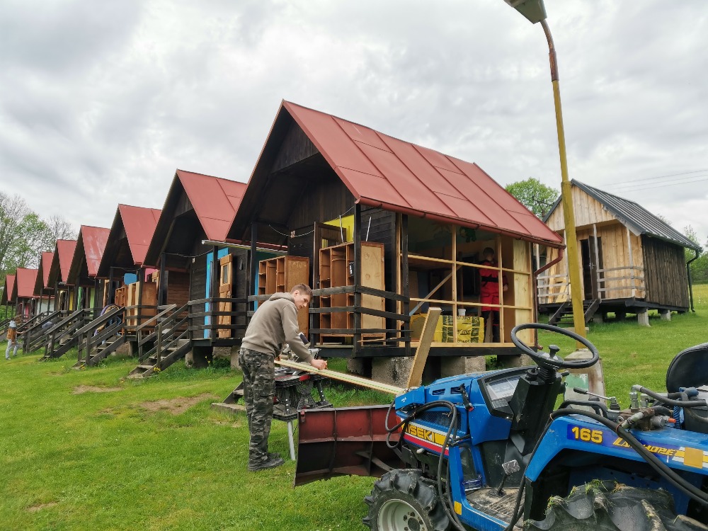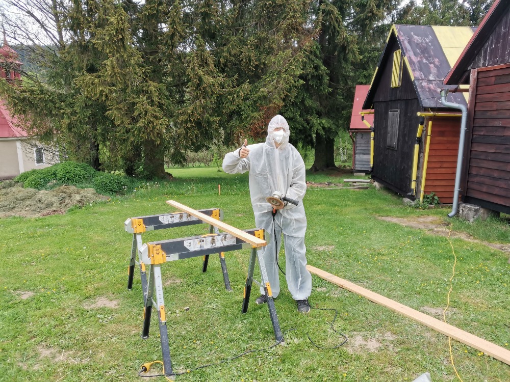 | brousíme prkna na vnější obšívku chatek |