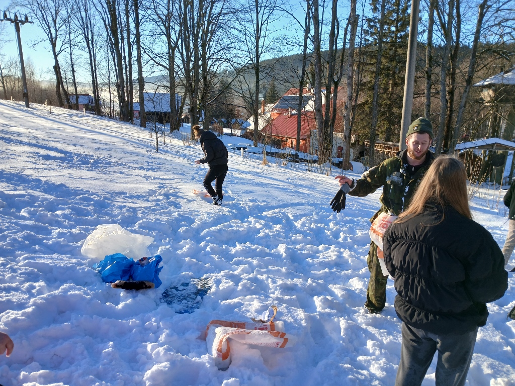 .jpg) | Hrátky na sněhu - následuje úprk před chodci - sjezd na igelitovém pytli |