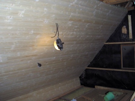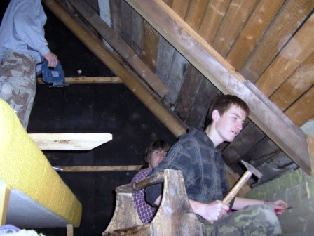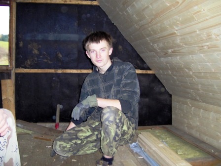 | Chlapi pracují na zušlechtění svého praktikantského doupětě - srubu |