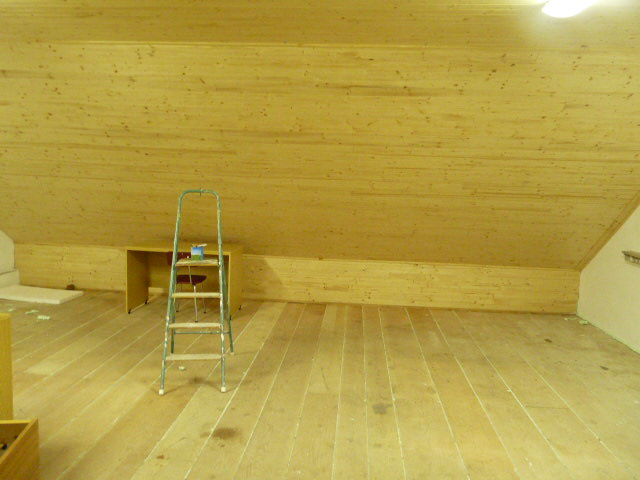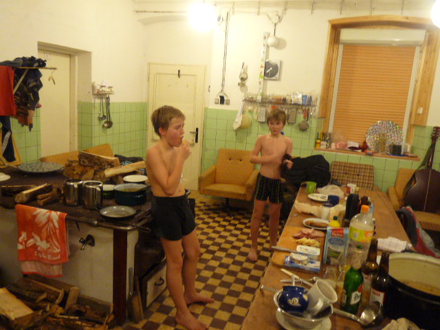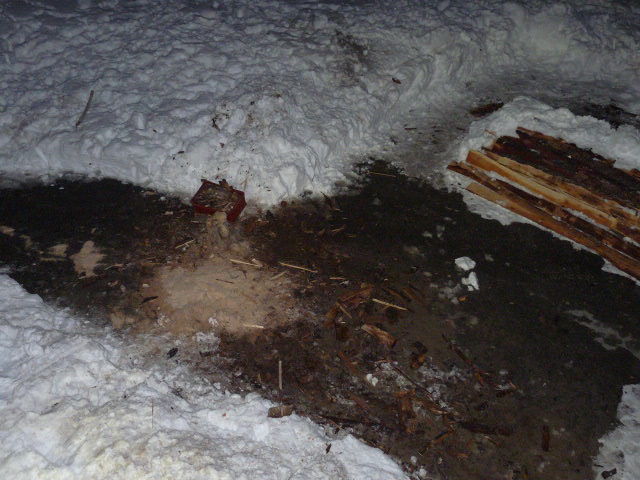| Celou sobotu jsme řezali, štípali a ukládali dřevo, takto vypadalo pracoviště v sobotu večer |
