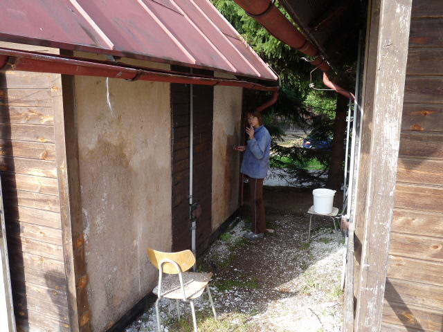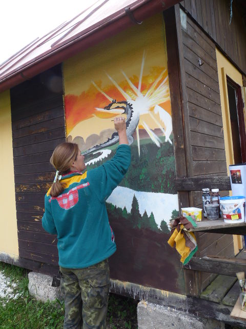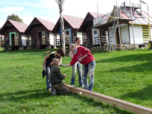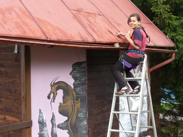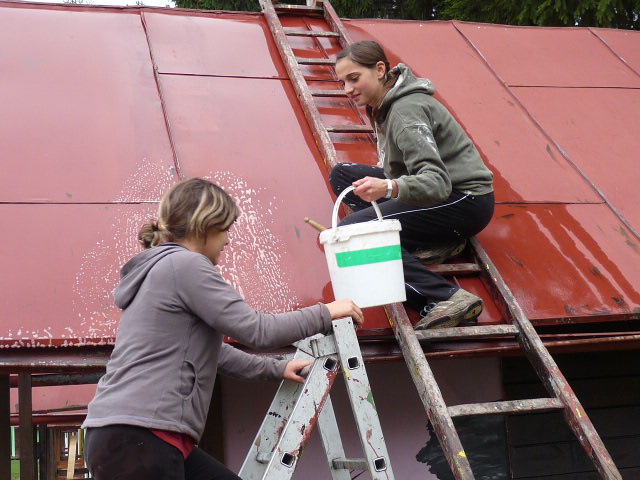 | Některé odvážlivkyně se pustily do nátěru střech chatek - Pozor pořádně se holky přivažte!! |