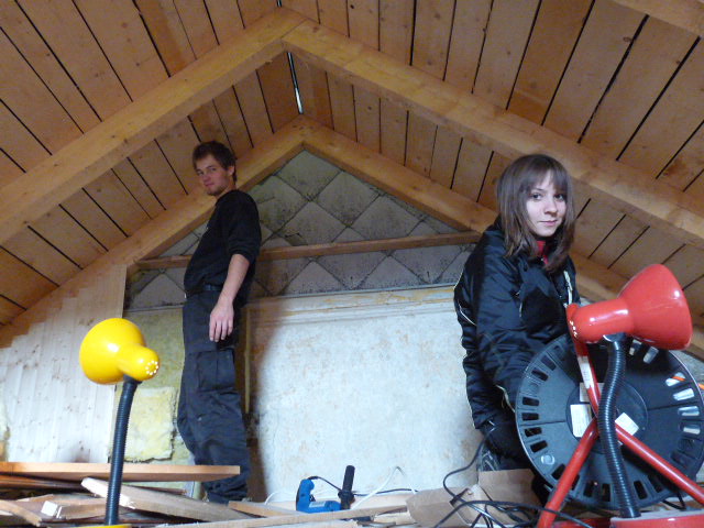 | Honzíík s Borůvkou se dali na půdičce do obkládání dřevem |