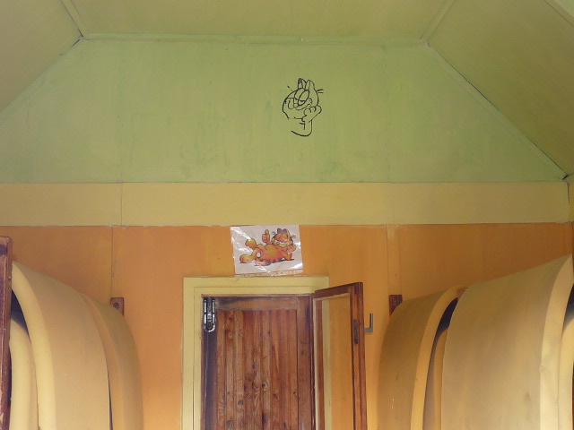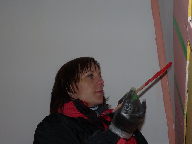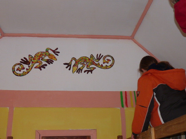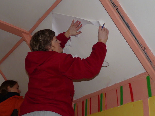 | Takto se malují obrázky jinou technologií - promítnutí dataprojektorem, překreslení obrysů a následné vybarvení - jsme v chatce u Šmoulů |