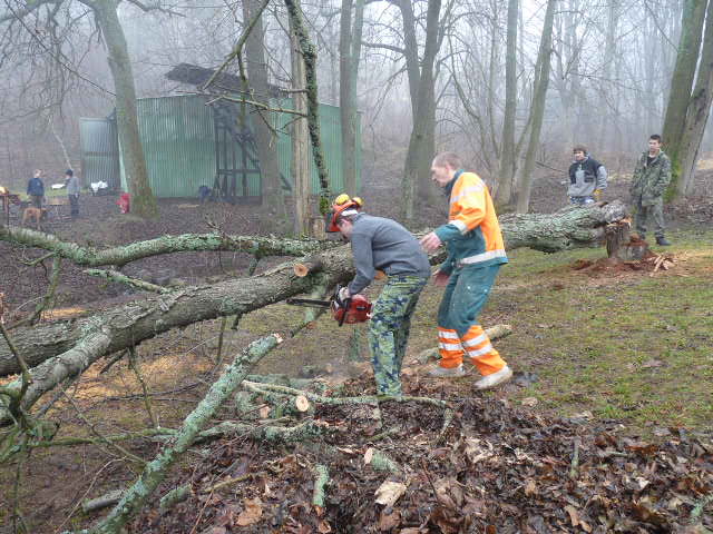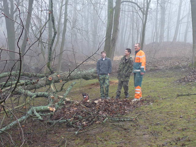 | Fero školí Frenka na práci s motorovou pilou, hlavně opatrně!! |