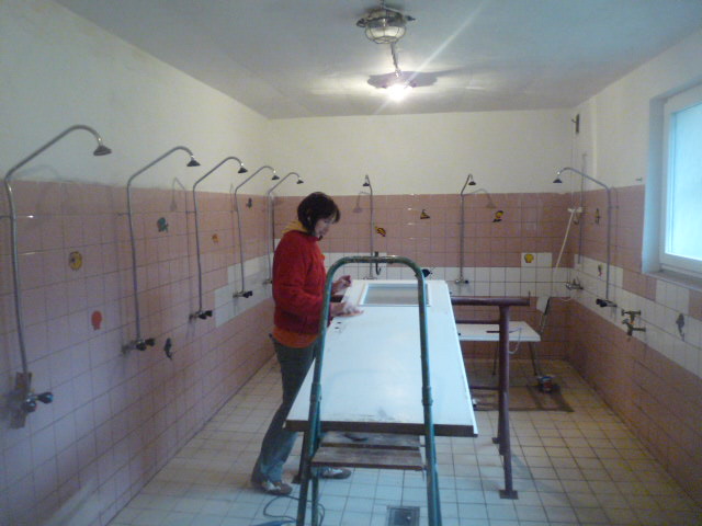 | Jana přeměnila sprchy v natěračskou dílnu - opravují se dveře na dívčí toalety |