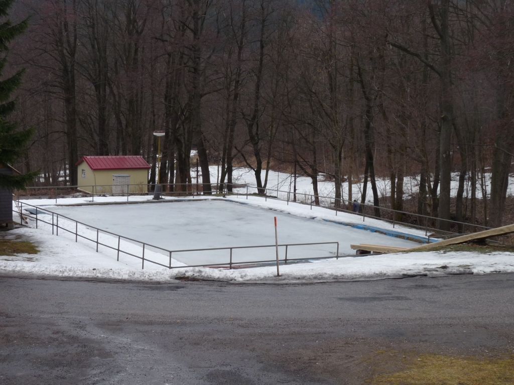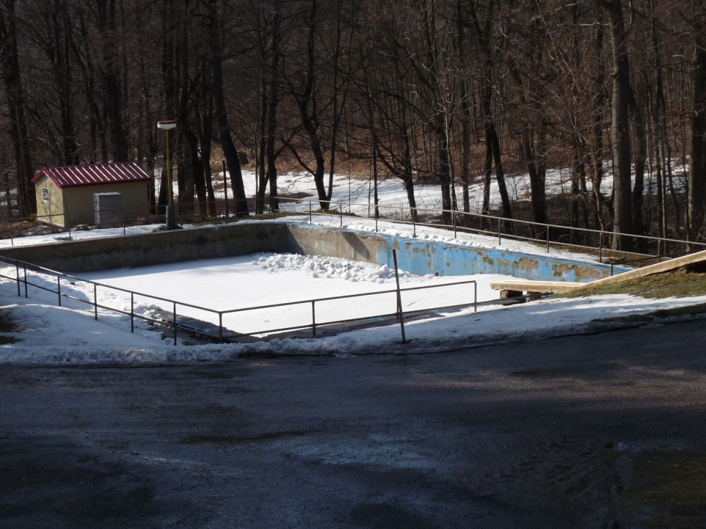 | Sobota ráno - bazén je ještě napuštěný a přikrytý 20cm ledu |