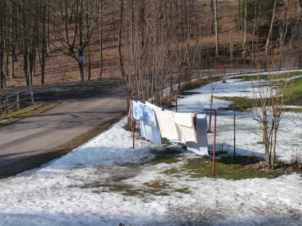 | Jaro je cítit ve vzduchu, pereme prádlo, Radka je věší ven |