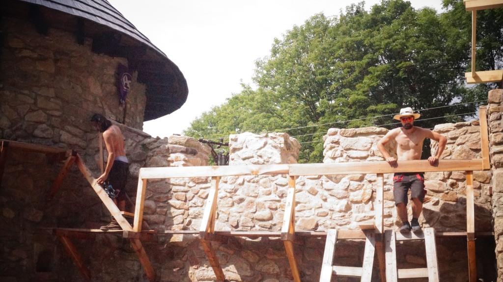 | I na hradě pokračuje činnost - hradní pání staví ochozy a dodělávají vstupní bránu |
