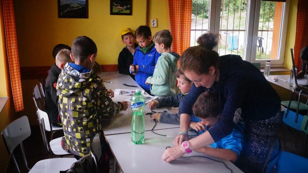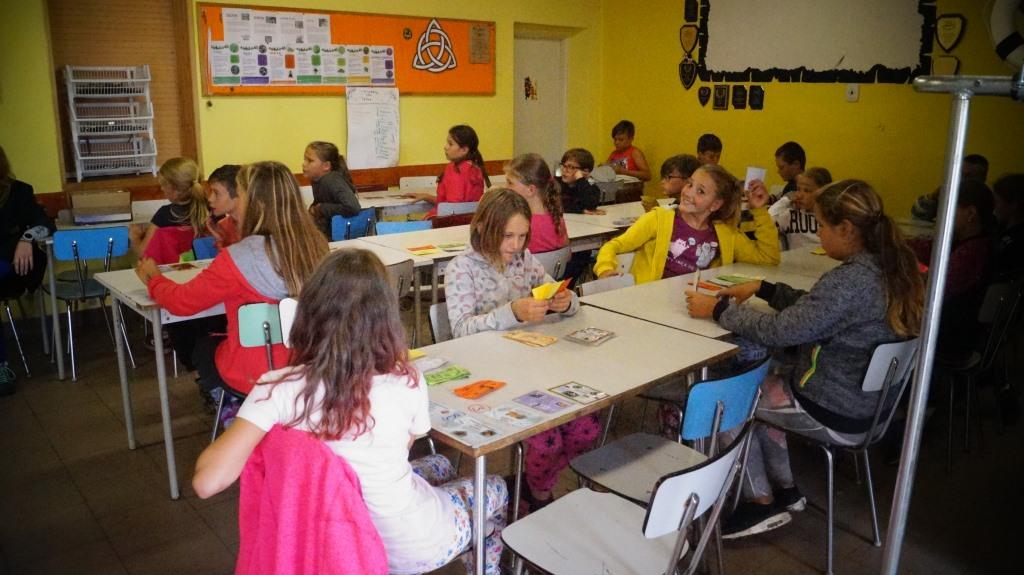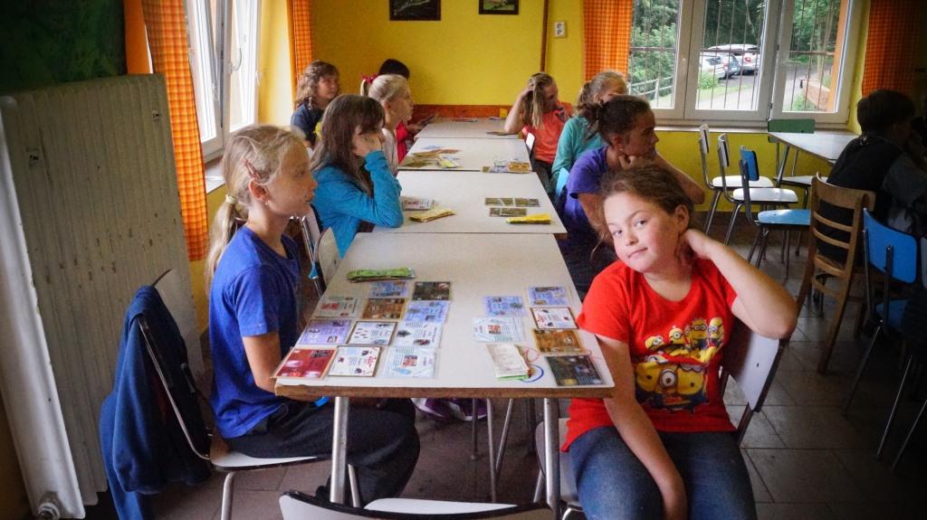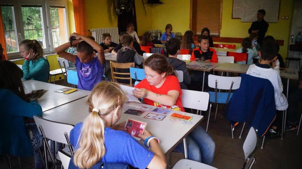 | Venku prší - obchodní hra Burza v jídelně - všimněte si již získaných akcií před hráči |