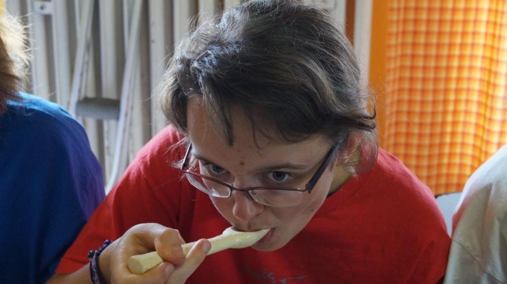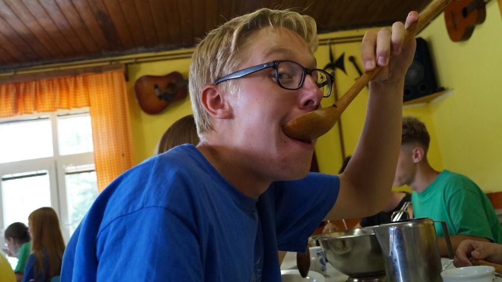 | Obědváme vyrobenými dřevěnými lžícemi |