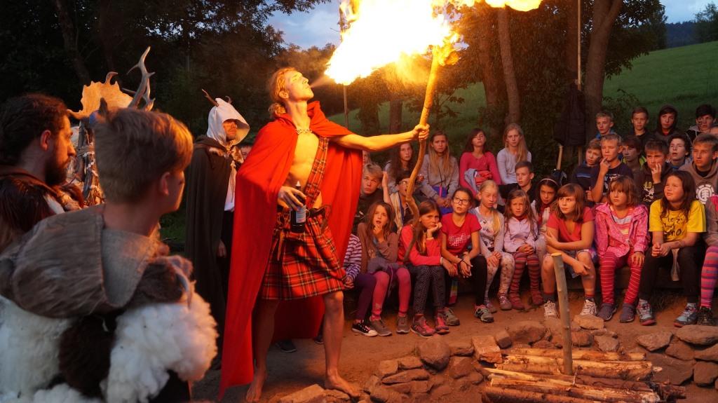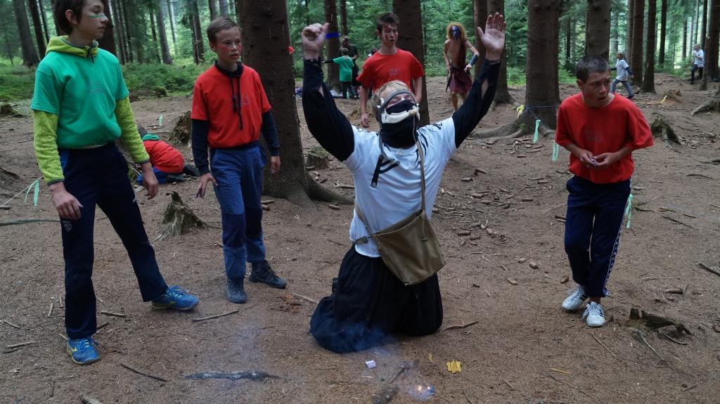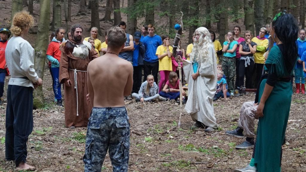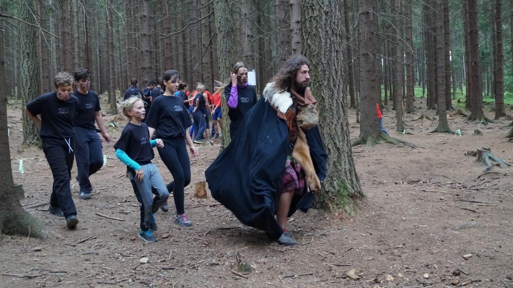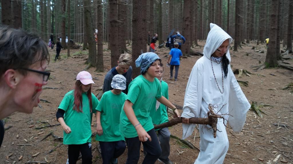 | Celotáborová hra Ve víru Many - levitující druid převádí svoji skupinu přes bažiny |