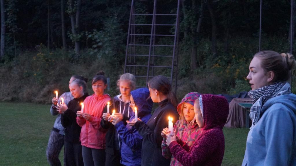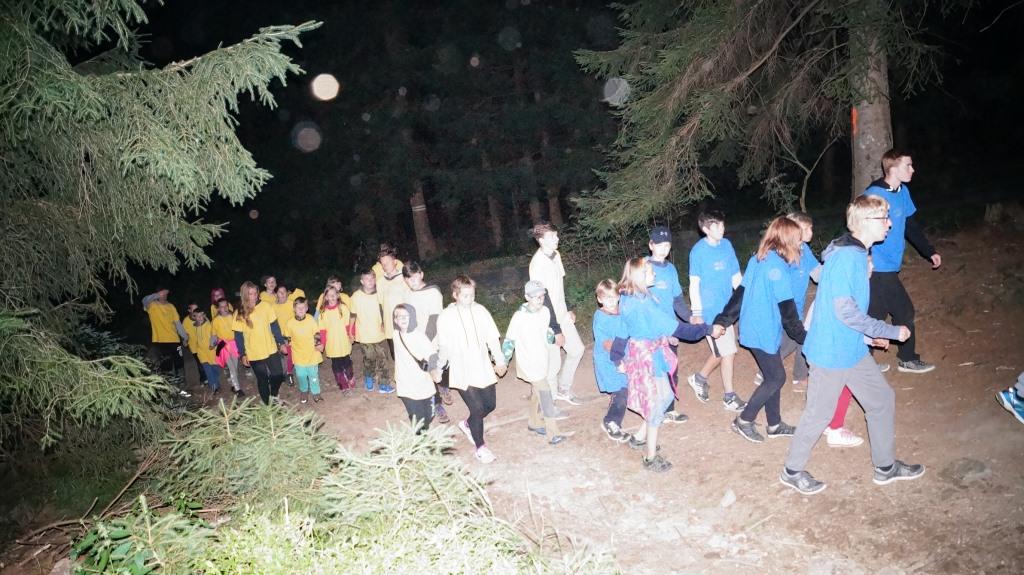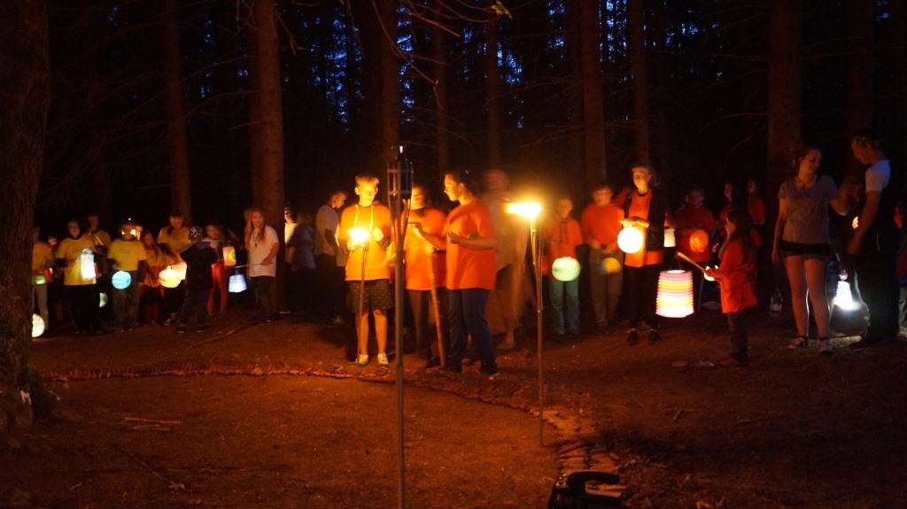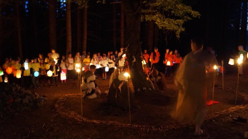 | Po závěrečné hře - lampiony u čarostromu + pokládání kamenů nováčků |