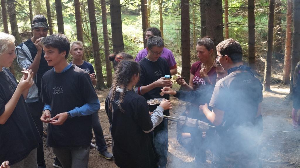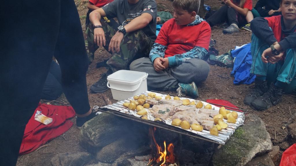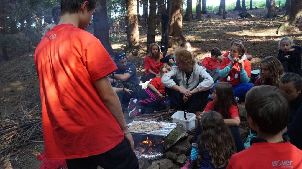 | 1 a 2 oddíl společně u ohně opékají buřtíky |