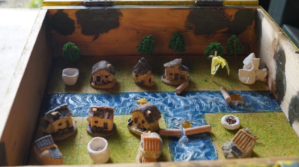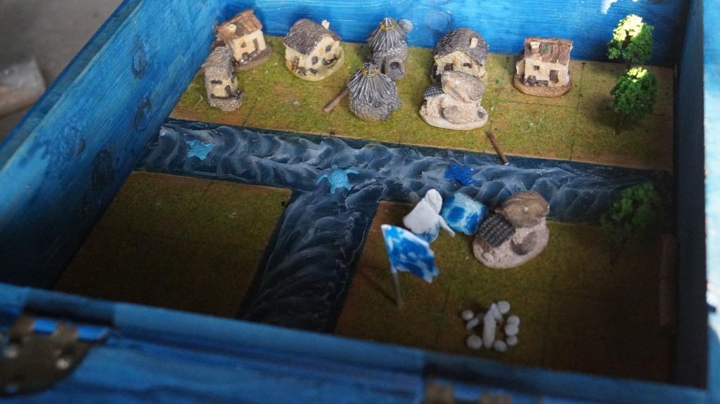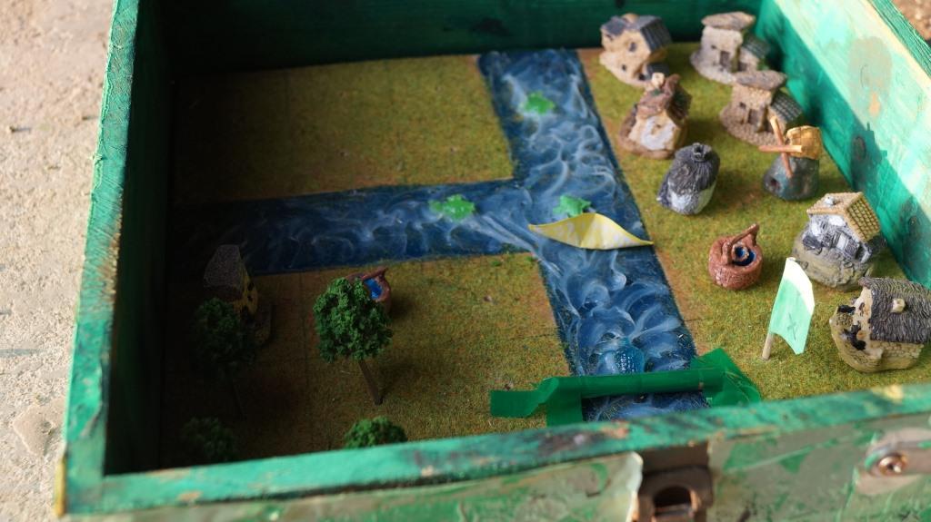 | Keltská půlhodinka - pohled na model keltské vesnice, kde se začínají objevovat sromy i domečky |